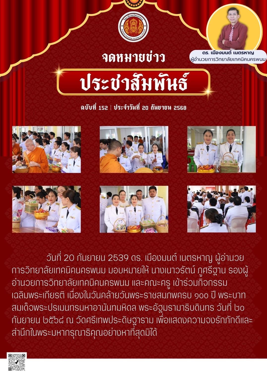 วันที่ 20 กันยายน 2539 ดร. เมืองมนต์ เนตรหาญ ผู้อำนวยการวิทยาลัยเทคนิคนครพนม มอบหมายให้ นางเนาวรัตน์ ภูศรีฐาน รองผู้อำนวยการวิทยาลัยเทคนิคนครพนม และคณะครู เข้าร่วมกิจกรรมเฉลิมพระเกียรติ เนื่องในวันคล้ายวันพระราชสมภพครบ ๑๐๐ ปี พระบาทสมเด็จพระปรเมนทรมหาอานันทมหิดล พระอัฐมรามาธิบดินทร วันที่ ๒๐ กันยายน ๒๕๖๘ ณ วัดศรีเทพประดิษฐาราม เพื่อแสดงความจงรักภักดีและสำนึกในพระมหากรุณาธิคุณอย่างหาที่สุดมิได้