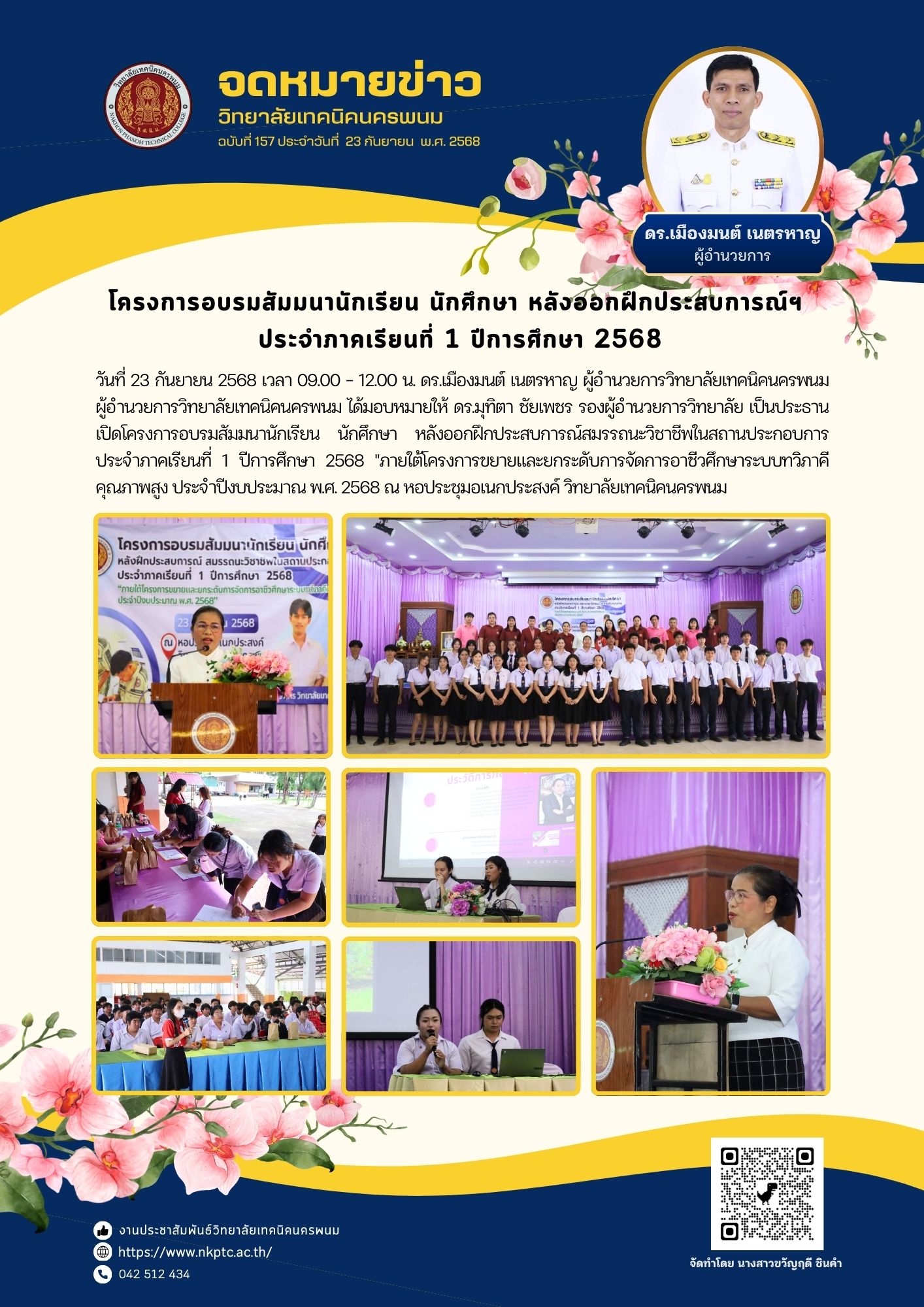 วันที่ 23 กันยายน 2568 เวลา 09.00 – 12.00 น. ดร.เมืองมนต์ เนตรหาญ ผู้อำนวยการวิทยาลัยเทคนิคนครพนม ผู้อำนวยการวิทยาลัยเทคนิคนครพนม ได้มอบหมายให้ ดร.มุทิตา ชัยเพชรรองผู้อำนวยการวิทยาลัยรองผู้อำนวยการ เป็นประธานเปิดโครงการอบรมสัมมนานักเรียน นักศึกษา หลังออกฝึกประสบการณ์สมรรถนะวิชาชีพในสถานประกอบการ ประจำภาคเรียนที่ 1 ปีการศึกษา 2568″ภายใต้โครงการขยายและยกระดับการจัดการอาชีวศึกษาระบบทวิภาคีคุณภาพสูง ประจำปีงบประมาณ พ.ศ. 2568 ณ หอประชุมอเนกประสงค์ วิทยาลัยเทคนิคนครพนม
