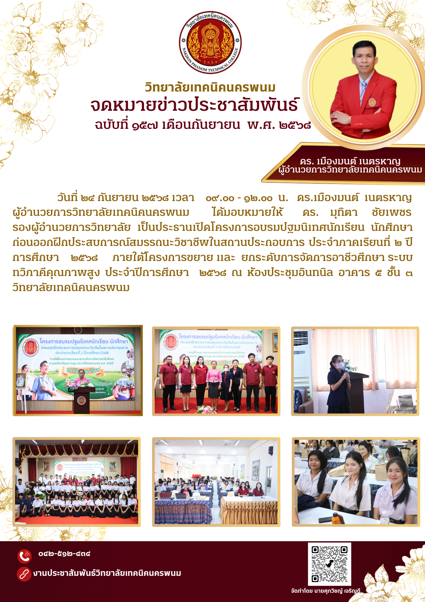 วันที่ 24 กันยายน 2568 เวลา 09.00 – 12.00 น. ดร.เมืองมนต์ เนตรหาญ ผู้อำนวยการวิทยาลัยเทคนิคนครพนม ได้มอบหมายให้ ดร.มุทิตา ชัยเพชร รองผู้อำนวยการวิทยาลัย เป็นประธานเปิดโครงการอบรมปฐมนิเทศนักเรียน นักศึกษา ก่อนออกฝึกประสบการณ์สมรรถนะวิชาชีพในสถานประกอบการ ประจำภาคเรียนที่ 1 ปีการศึกษา 2568 ภายใต้โครงการขยายและยกระดับการจัดการอาชีวศึกษาระบบทวิภาคีคุณภาพสูง ประจำปีงบประมาณ พ.ศ. 2568 ณ ห้องประชุมอินทนิล อาคาร 5 ชั้น 3 วิทยาลัยเทคนิคนครพนม