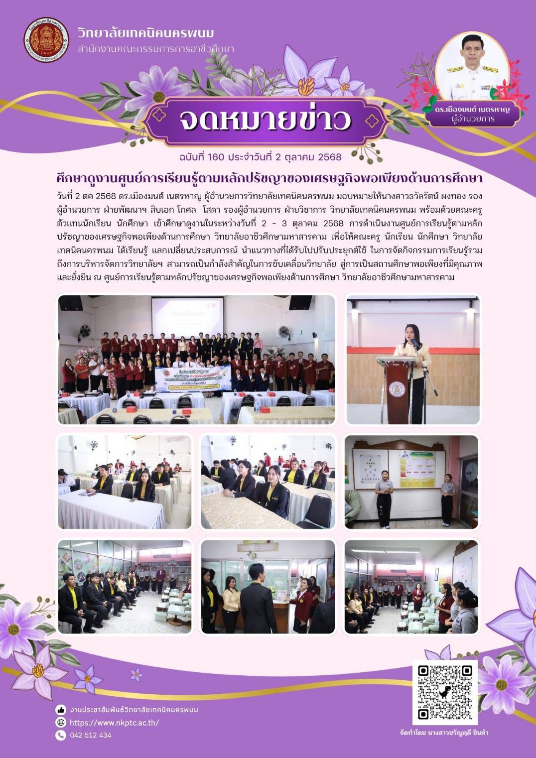 วันที่ 2 ตุลาคม 2568 ดร.เมืองมนต์ เนตรหาญ ผู้อำนวยการวิทยาลัยเทคนิคนครพนม มอบหมายให้นางสาวธวัลรัตน์ ผงทอง รองผู้อำนวยการ ฝ่ายพัฒนาฯ สิบเอก โกศล โสดา รองผู้อำนวยการ ฝ่ายวิชาการ วิทยาลัยเทคนิคนครพนม พร้อมด้วยคณะครู ตัวแทนนักเรียน นักศึกษา เข้าศึกษาดูงานในระหว่างวันที่ 2 -3 ตุลาคม 2568 การดำเนินงานศูนย์การเรียนรู้ตามหลักปรัชญาของเศรษฐกิจพอเพียงด้านการศึกษา วิทยาลัยอาชีวศึกษามหาสารคาม เพื่อให้คณะครู นักเรียน นักศึกษา วิทยาลัยเทคนิคนครพนม ได้เรียนรู้ แลกเปลี่ยนประสบการณ์ นำแนวทางที่ได้รับไปปรับประยุกต์ใช้ ในการจัดกิจกรรมการเรียนรู้รวมถึงการบริหารจัดการวิทยาลัยฯ สามารถเป็นกำลังสำคัญในการขับเคลื่อนวิทยาลัย สู่การเป็นสถานศึกษาพอเพียงที่มีคุณภาพและยั่งยืน ณ ศูนย์การเรียนรู้ตามหลักปรัชญาของเศรษฐกิจพอเพียงด้านการศึกษา วิทยาลัยอาชีวศึกษามหาสารคาม
