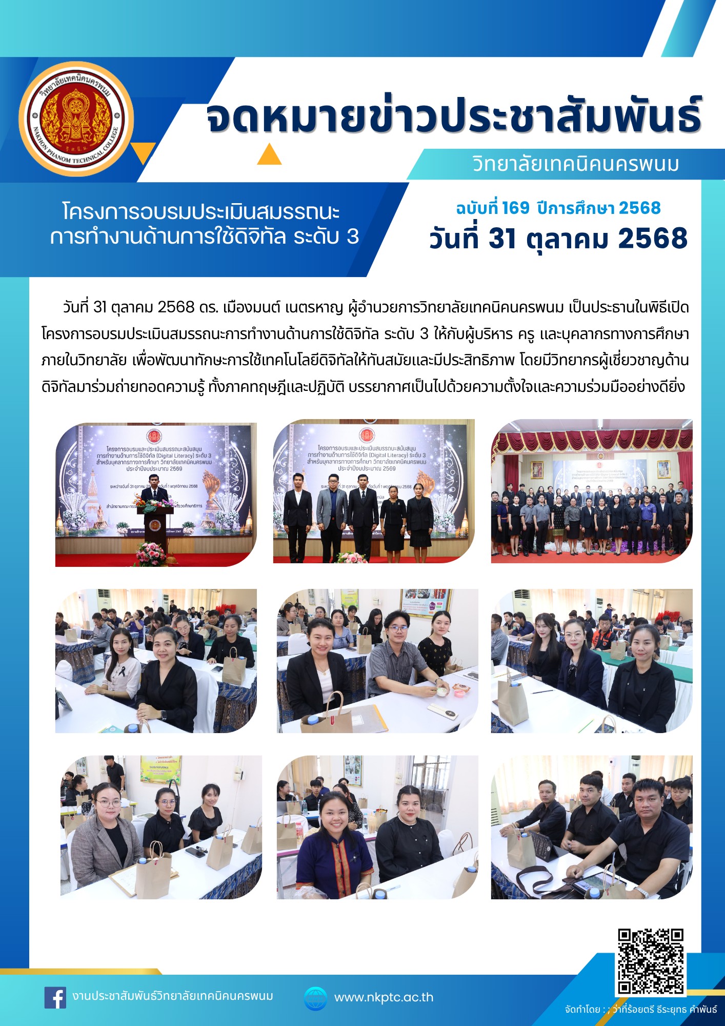 วันที่ 31 ตุลาคม 2568 ดร. เมืองมนต์ เนตรหาญ ผู้อำนวยการวิทยาลัยเทคนิคนครพนม เป็นประธานในพิธีเปิด โครงการอบรมประเมินสมรรถนะการทำงานด้านการใช้ดิจิทัล ระดับ 3 ให้กับผู้บริหาร ครู และบุคลากรทางการศึกษา ภายในวิทยาลัย เพื่อพัฒนาทักษะการใช้เทคโนโลยีดิจิทัลให้ทันสมัยและมีประสิทธิภาพ โดยมีวิทยากรผู้เชี่ยวชาญด้านดิจิทัลมาร่วมถ่ายทอดความรู้ ทั้งภาคทฤษฎีและปฏิบัติบรรยากาศเป็นไปด้วยความตั้งใจและความร่วมมืออย่างดียิ่ง