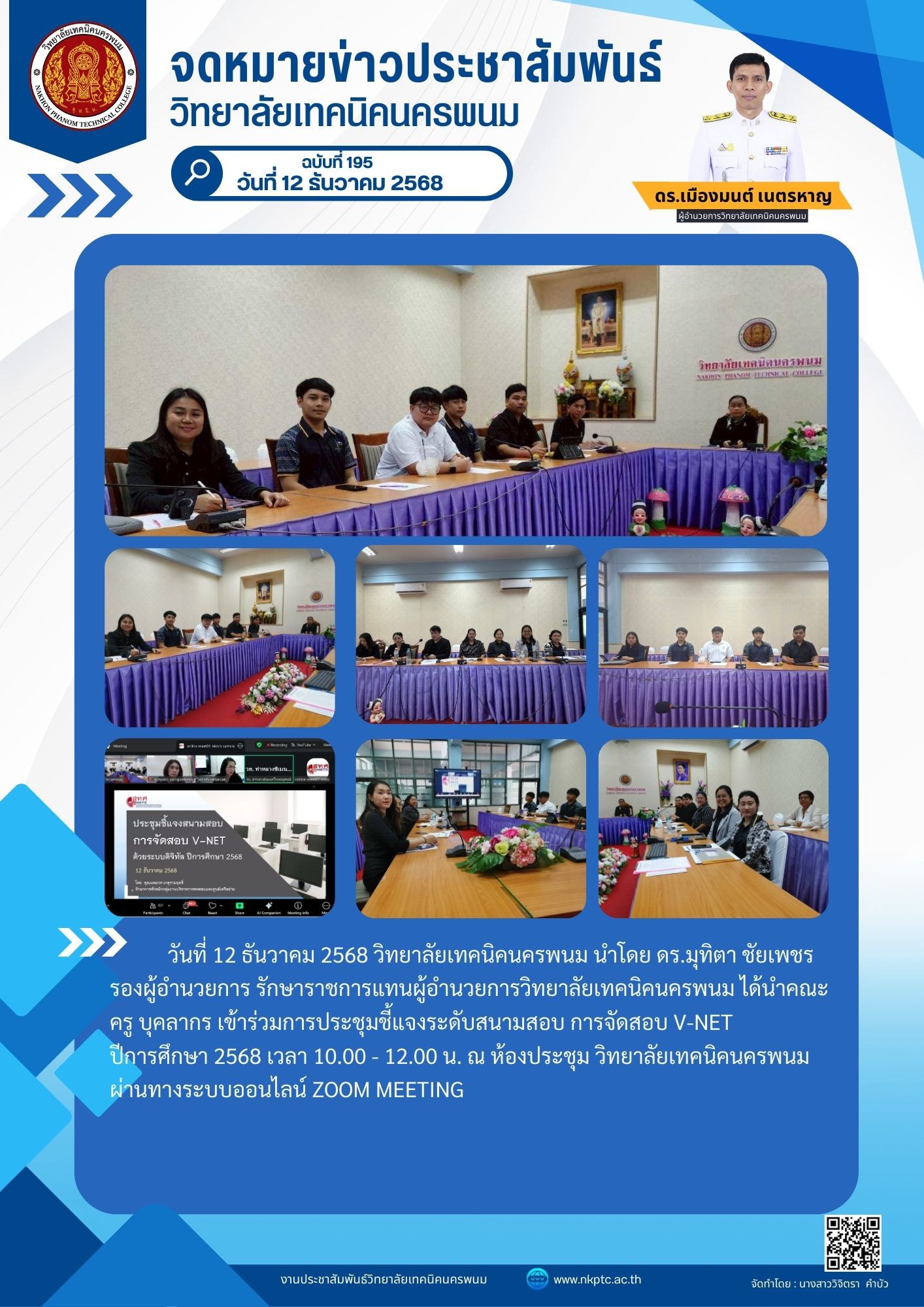 วันที่ 12 ธันวาคม 2568 วิทยาลัยเทคนิคนครพนม นำโดย ดร.มุทิตา ชัยเพชร รองผู้อำนวยการ รักษาราชการแทนผู้อำนวยการวิทยาลัยเทคนิคนครพนม ได้นำคณะครู บุคลากร เข้าร่วมการประชุมชี้แจงระดับสนามสอบ การจัดสอบ V-NET ปีการศึกษา 2568 เวลา 10.00 – 12.00 น. ณ ห้องประชุม วิทยาลัยเทคนิคนครพนม ผ่านทางระบบออนไลน์ Zoom Meeting