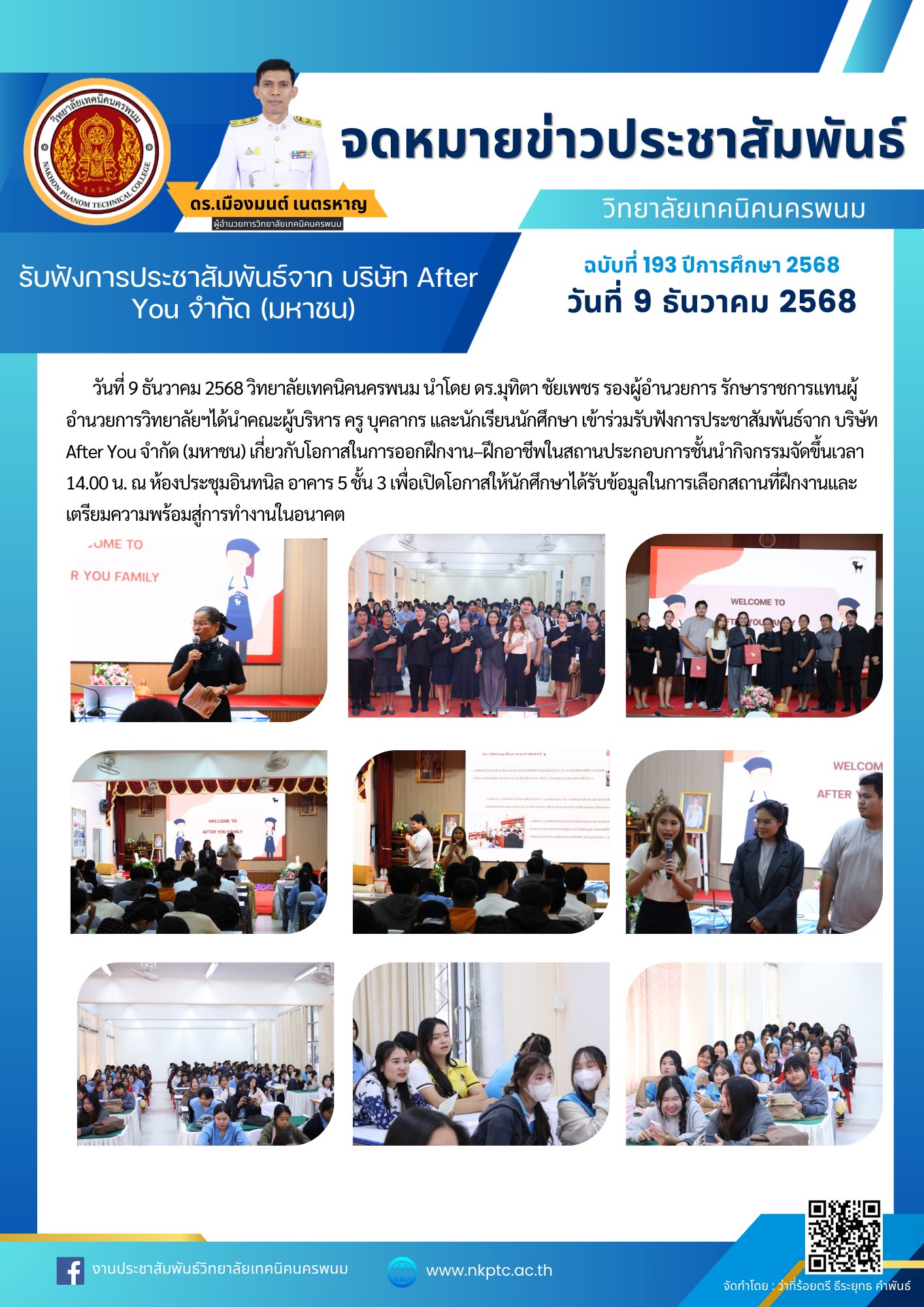 วันที่ 9 ธันวาคม 2568 วิทยาลัยเทคนิคนครพนม นำโดย ดร.มุทิตา ชัยเพชร รองผู้อำนวยการ รักษาราชการแทนผู้อำนวยการวิทยาลัยฯได้นำคณะผู้บริหาร ครู บุคลากร และนักเรียนนักศึกษา เข้าร่วมรับฟังการประชาสัมพันธ์จาก บริษัท After You จำกัด (มหาชน)เกี่ยวกับโอกาสในการออกฝึกงาน–ฝึกอาชีพในสถานประกอบการชั้นนำกิจกรรมจัดขึ้นเวลา 14.00 น. ณ ห้องประชุมอินทนิล อาคาร 5 ชั้น 3 เพื่อเปิดโอกาสให้นักศึกษาได้รับข้อมูลในการเลือกสถานที่ฝึกงานและเตรียมความพร้อมสู่การทำงานในอนาคต