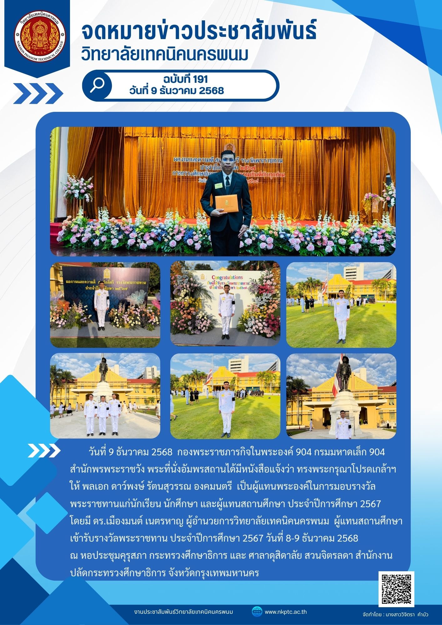 โดยมี ดร.เมืองมนต์ เนตรหาญ ผู้อำนวยการวิทยาลัยเทคนิคนครพนม ผู้แทนสถานศึกษาเข้ารับรางวัลพระราชทาน ประจำปีการศึกษา 2567 วันที่ 8-9 ธันวาคม 2568 ณ หอประชุมคุรุสภา กระทรวงศึกษาธิการ และ ศาลาดุสิดาลัย สวนจิตรลดา สำนักงานปลัดกระทรวงศึกษาธิการ จังหวัดกรุงเทพมหานคร ภาพกิจกรรม :