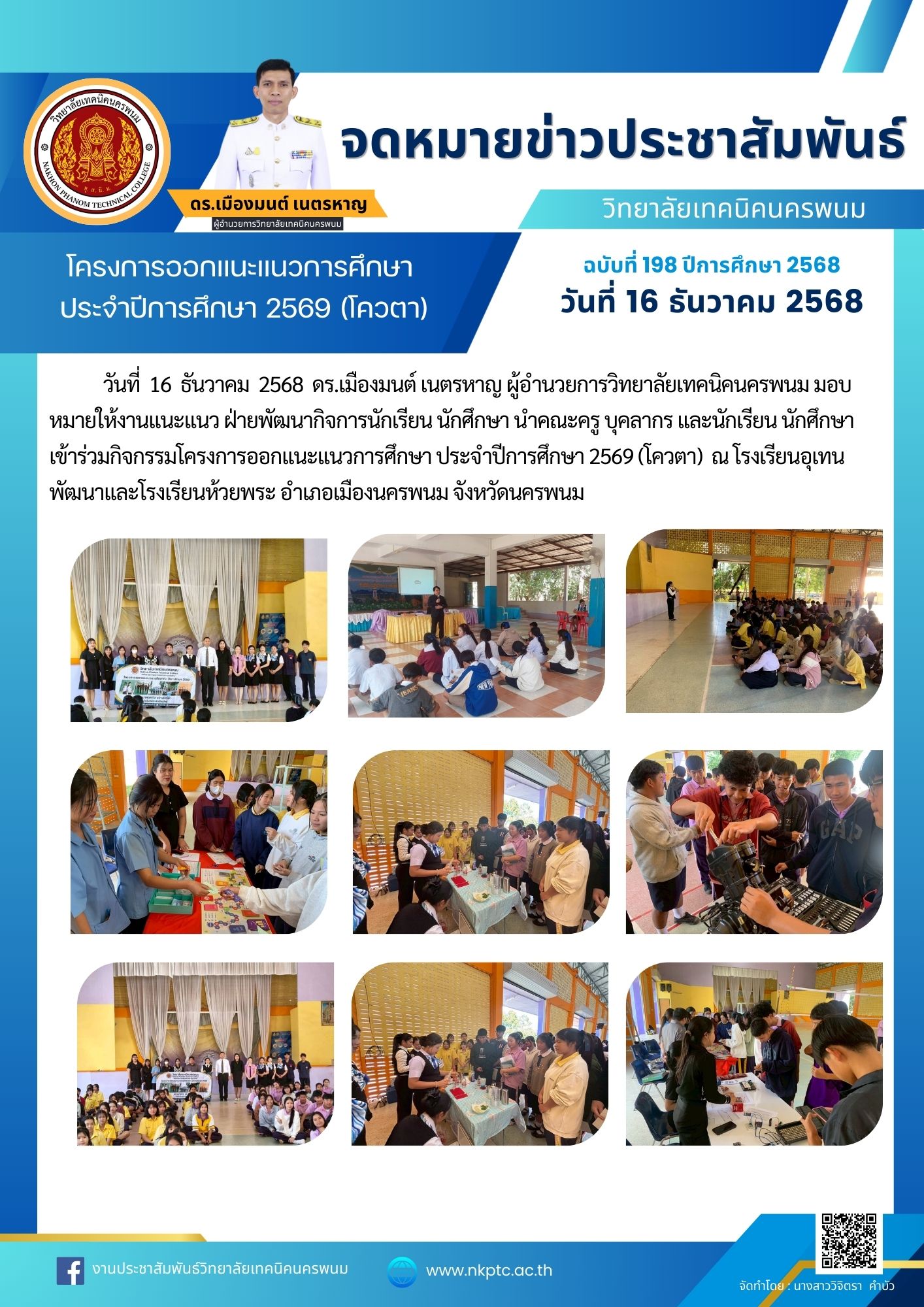 วันที่ 16 ธันวาคม 2568 ดร.เมืองมนต์ เนตรหาญ ผู้อำนวยการวิทยาลัยเทคนิคนครพนม มอบหมายให้งานแนะแนว ฝ่ายพัฒนากิจการนักเรียน นักศึกษา นำคณะครู บุคลากร และนักเรียน นักศึกษา เข้าร่วมกิจกรรมโครงการออกแนะแนวการศึกษา ประจำปีการศึกษา 2569 (โควตา) ณ โรงเรียนอุเทน