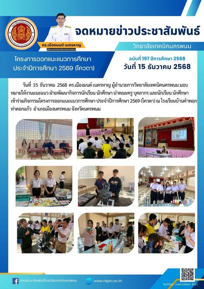 วันที่ 15 ธันวาคม 2568 ดร.เมืองมนต์ เนตรหาญ ผู้อำนวยการวิทยาลัยเทคนิคนครพนม มอบหมายให้งานแนะแนว ฝ่ายพัฒนากิจการนักเรียน นักศึกษา นำคณะครู บุคลากร และนักเรียน นักศึกษา เข้าร่วมกิจกรรมโครงการออกแนะแนวการศึกษา ประจำปีการศึกษา 2569 (โควตา) ณ โรงเรียนบ้านคำพอกท่าดอกแก้ว อำเภอเมืองนครพนม จังหวัดนครพนม ภาพกิจกรรม : https://drive.google.com/…/1lVHdg9QsyablTPdsIFhw8wfgH5e…