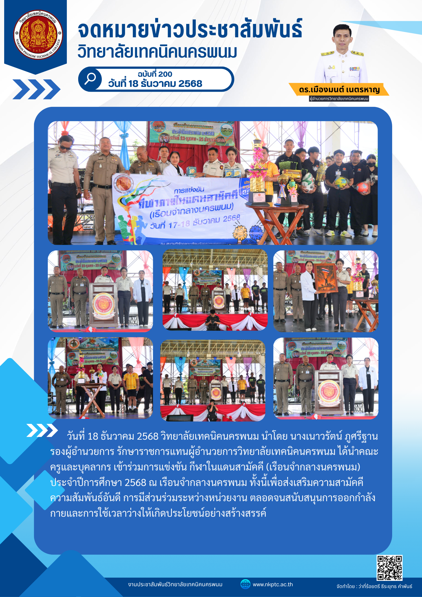 วันที่ 18 ธันวาคม 2568 วิทยาลัยเทคนิคนครพนม นำโดย นางเนาวรัตน์ ภูศรีฐาน รองผู้อำนวยการ รักษาราชการแทนผู้อำนวยการวิทยาลัยเทคนิคนครพนม ได้นำคณะครูและบุคลากร เข้าร่วมการแข่งขัน กีฬาในแดนสามัคคี (เรือนจำกลางนครพนม) ประจำปีการศึกษา 2568 ณ เรือนจำกลางนครพนม ทั้งนี้เพื่อส่งเสริมความสามัคคี ความสัมพันธ์อันดี การมีส่วนร่วมระหว่างหน่วยงานตลอดจนสนับสนุนการออกกำลังกายและการใช้เวลาว่างให้เกิดประโยชน์อย่างสร้างสรรค์