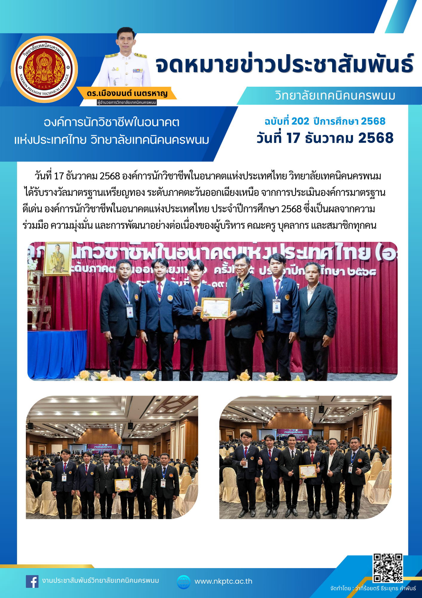 วันที่ 17 ธันวาคม 2568 องค์การนักวิชาชีพในอนาคตแห่งประเทศไทย วิทยาลัยเทคนิคนครพนมได้รับรางวัลมาตรฐานเหรียญทอง ระดับภาคตะวันออกเฉียงเหนือ จากการประเมินองค์การมาตรฐานดีเด่น องค์การนักวิชาชีพในอนาคตแห่งประเทศไทย ประจำปีการศึกษา 2568ซึ่งเป็นผลจากความร่วมมือความมุ่งมั่นและการพัฒนาอย่างต่อเนื่องของผู้บริหาร คณะครู บุคลากร และสมาชิกทุกคน