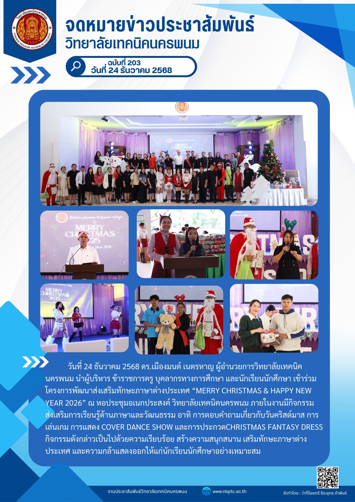 วันที่ 24 ธันวาคม 2568 ดร.เมืองมนต์ เนตรหาญ ผู้อำนวยการวิทยาลัยเทคนิคนครพนม นำผู้บริหาร ข้าราชการครู บุคลากรทางการศึกษา และนักเรียนนักศึกษา เข้าร่วมโครงการพัฒนาส่งเสริมทักษะภาษาต่างประเทศ “Merry Christmas & Happy New Year 2026” ณ หอประชุมอเนกประสงค์ วิทยาลัยเทคนิคนครพนม ภายในงานมีกิจกรรมส่งเสริมการเรียนรู้ด้านภาษาและวัฒนธรรม อาทิ การตอบคำถามเกี่ยวกับวันคริสต์มาส การเล่นเกม การแสดง Cover Dance Show และการประกวดChristmas Fantasy Dress กิจกรรมดังกล่าวเป็นไปด้วยความเรียบร้อย สร้างความสนุกสนาน เสริมทักษะภาษาต่างประเทศ และความกล้าแสดงออกให้แก่นักเรียนนักศึกษาอย่างเหมาะสม