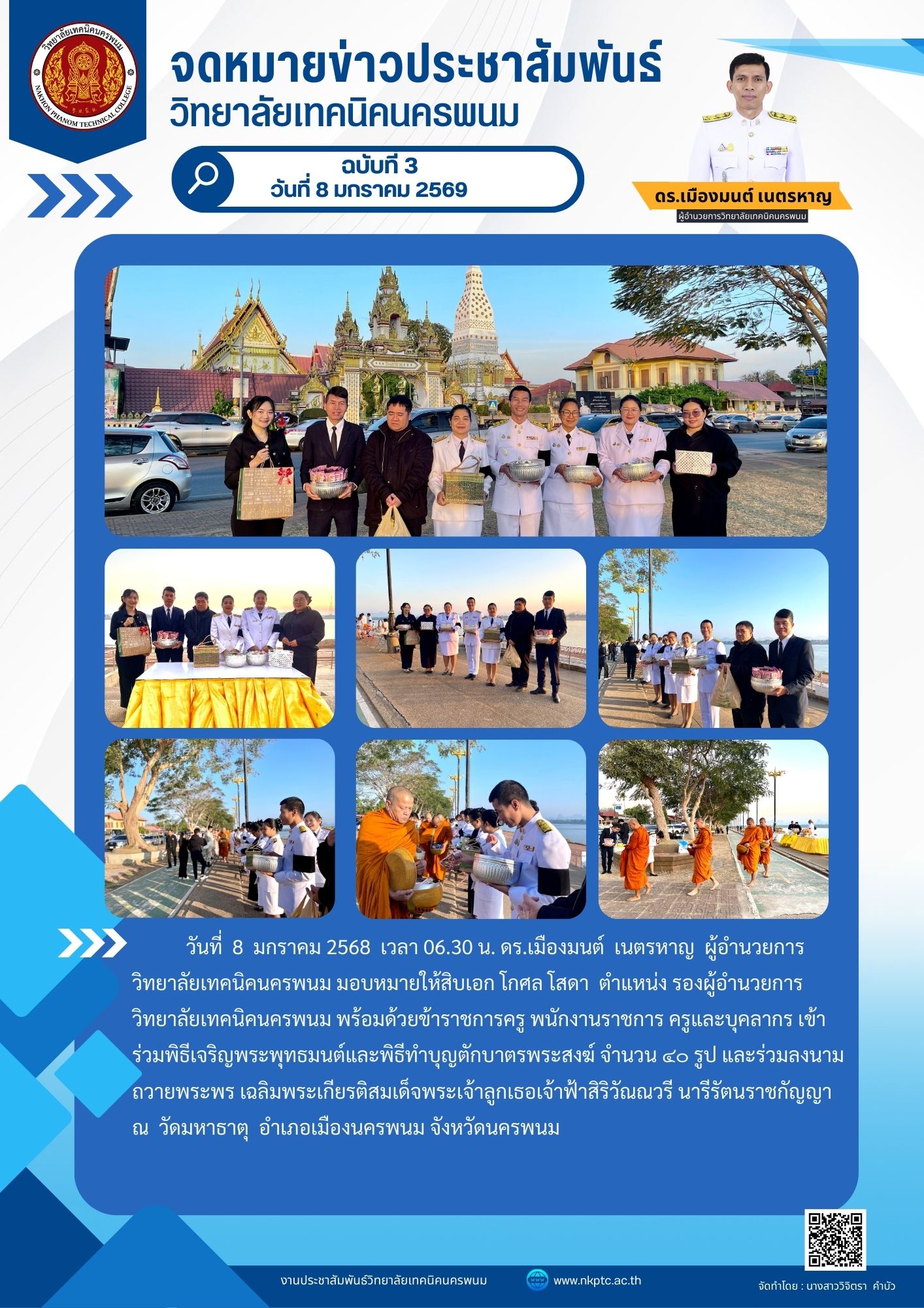 วันที่ 8 มกราคม 2568 เวลา 06.30 น. ดร.เมืองมนต์ เนตรหาญ ผู้อำนวยการวิทยาลัยเทคนิคนครพนม มอบหมายให้สิบเอก โกศล โสดา ตำแหน่ง รองผู้อำนวยการวิทยาลัยเทคนิคนครพนม พร้อมด้วยข้าราชการครู พนักงานราชการ ครูและบุคลากร เข้าร่วมพิธีเจริญพระพุทธมนต์และพิธีทำบุญตักบาตรพระสงฆ์ จำนวน ๔๐ รูป และร่วมลงนามถวายพระพร เฉลิมพระเกียรติสมเด็จพระเจ้าลูกเธอเจ้าฟ้าสิริวัณณวรี นารีรัตนราชกัญญา ณ วัดมหาธาตุ อำเภอเมืองนครพนม จังหวัดนครพนม ภาพกิจกรรม : https://drive.google.com/…/1RTj1YRp9joTKtGONB_LH6rUgc…