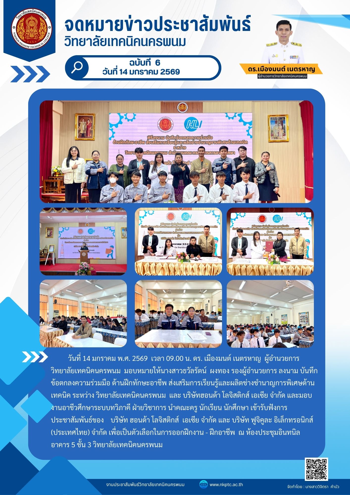 วันที่ 14 มกราคม พ.ศ. 2569 เวลา 09.00 น. ดร. เมืองมนต์ เนตรหาญ ผู้อำนวยการวิทยาลัยเทคนิคนครพนม มอบหมายให้นางสาวธวัลรัตน์ ผงทอง รองผู้อำนวยการ ลงนาม บันทึกข้อตกลงความร่วมมือ ด้านฝึกทักษะอาชีพ ส่งเสริมการเรียนรู้และผลิตช่างชำนาญการพิเศษด้านเทคนิค ระหว่าง วิทยาลัยเทคนิคนครพนม และ บริษัทฮอนด้า โลจิสติกส์ เอเซีย จำกัด และมอบงานอาชีวศึกษาระบบทวิภาคี ฝ่ายวิชาการ นำคณะครู นักเรียน นักศึกษา เข้ารับฟังการประชาสัมพันธ์ของ บริษัท ฮอนด้า โลจิสติกส์ เอเซีย จำกัด และ บริษัท ฟูจิคูละ อิเล็กทรอนิกส์ (ประเทศไทย) จำกัด เพื่อเป็นตัวเลือกในการออกฝึกงาน – ฝึกอาชีพ ณ ห้องประชุมอินทนิล อาคาร 5 ชั้น 3 วิทยาลัยเทคนิคนครพนม ภาพกิจกรรม : https://drive.google.com/drive/folders/13viWw2bHI2LKmT63iNExthV_pSA13Mkl