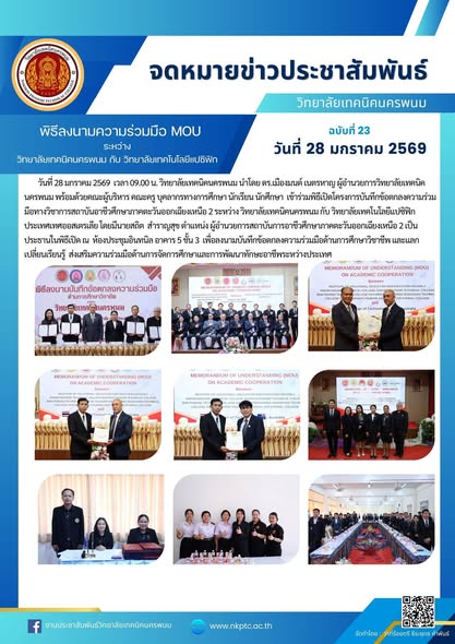 วันที่ 28 มกราคม 2569 เวลา 09.00 น. วิทยาลัยเทคนิคนครพนม นำโดย ดร.เมืองมนต์ เนตรหาญ ผู้อำนวยการวิทยาลัยเทคนิคนครพนม พร้อมด้วยคณะผู้บริหาร คณะครู บุคลากรทางการศึกษา นักเรียน นักศึกษา เข้าร่วมพิธีเปิดโครงการบันทึกข้อตกลงความร่วมมือทางวิชาการสถาบันอาชีวศึกษาภาคตะวันออกเฉียงเหนือ 2 ระหว่าง วิทยาลัยเทคนิคนครพนม กับ วิทยาลัยเทคโนโลยีแปซิฟิก ประเทศเทศออสเตรเลีย โดยมีนายสถิต สำราญสุข ตำแหน่ง ผู้อำนวยการสถาบันการอาชีวศึกษาภาคตะวันออกเฉียงเหนือ 2 เป็นประธานในพิธีเปิด ณ ห้องประชุมอินทนิล อาคาร 5 ชั้น 3 เพื่อลงนามบันทึกข้อตกลงความร่วมมือด้านการศึกษาวิชาชีพ และแลกเปลี่ยนเรียนรู้ ส่งเสริมความร่วมมือด้านการจัดการศึกษาและการพัฒนาทักษะอาชีพระหว่างประเทศ ภาพกิจกรรม : https://drive.google.com/…/1oxwmcQ…