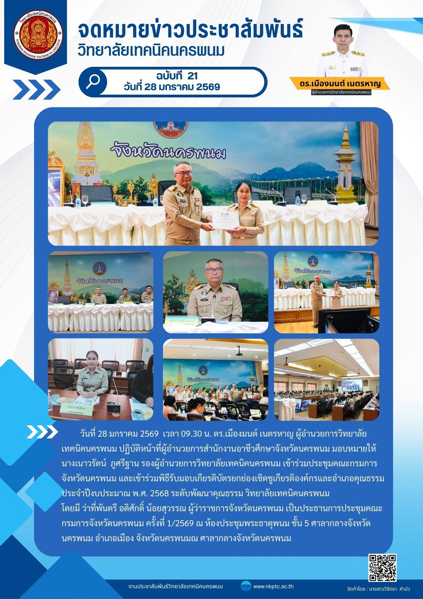 วันที่ 28 มกราคม 2569 เวลา 09.30 น. ดร.เมืองมนต์ เนตรหาญ ผู้อำนวยการวิทยาลัยเทคนิคนครพนม ปฏิบัติหน้าที่ผู้อำนวยการสำนักงานอาชีวศึกษาจังหวัดนครพนม มอบหมายให้นางเนาวรัตน์ ภูศรีฐาน รองผู้อำนวยการวิทยาลัยเทคนิคนครพนม เข้าร่วมประชุมคณะกรมการจังหวัดนครพนม และเข้าร่วมพิธีรับมอบเกียรติบัตรยกย่องเชิดชูเกียรติองค์กรและอำเภอคุณธรรม ประจำปีงบประมาณ พ.ศ. 2568 ระดับพัฒนาคุณธรรม วิทยาลัยเทคนิคนครพนม โดยมี ว่าที่พันตรี อดิศักดิ์ น้อยสุวรรณ ผู้ว่าราชการจังหวัดนครพนม เป็นประธานการประชุมคณะกรมการจังหวัดนครพนม ครั้งที่ 1/2569 ณ ห้องประชุมพระธาตุพนม ชั้น 5 ศาลากลางจังหวัดนครพนม อำเภอเมือง จังหวัดนครพนมณ ศาลากลางจังหวัดนครพนม ภาพกิจกรรม : https://drive.google.com/…/1ZPPaUXFvYzqfzCYULieDXO2y6sT…