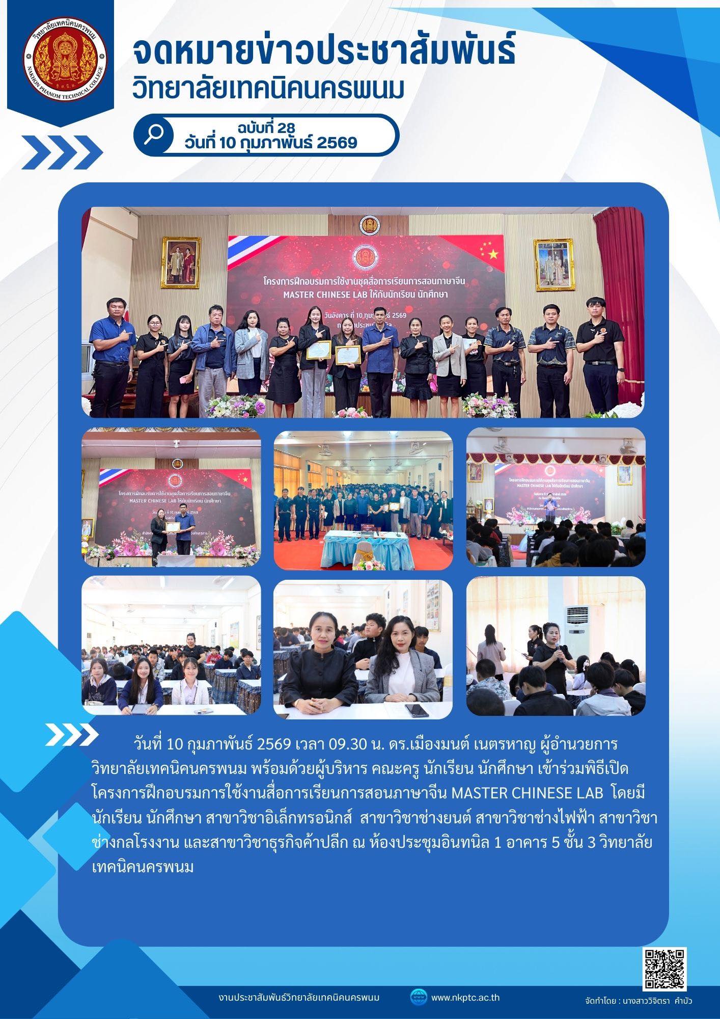 วันที่ 10 กุมภาพันธ์ 2569 เวลา 09.30 น. ดร.เมืองมนต์ เนตรหาญ ผู้อำนวยการวิทยาลัยเทคนิคนครพนม พร้อมด้วยผู้บริหาร คณะครู นักเรียน นักศึกษา เข้าร่วมพิธีเปิดโครงการฝึกอบรมการใช้งานสื่อการเรียนการสอนภาษาจีน Master Chinese LAB โดยมีนักเรียน นักศึกษา สาขาวิชาอิเล็กทรอนิกส์ สาขาวิชาช่างยนต์ สาขาวิชาช่างไฟฟ้า สาขาวิชาช่างกลโรงงาน และสาขาวิชาธุรกิจค้าปลีก ณ ห้องประชุมอินทนิล 1 อาคาร 5 ชั้น 3 วิทยาลัยเทคนิคนครพนม ภาพกิจกรรม :https://drive.google.com/…/1Q…