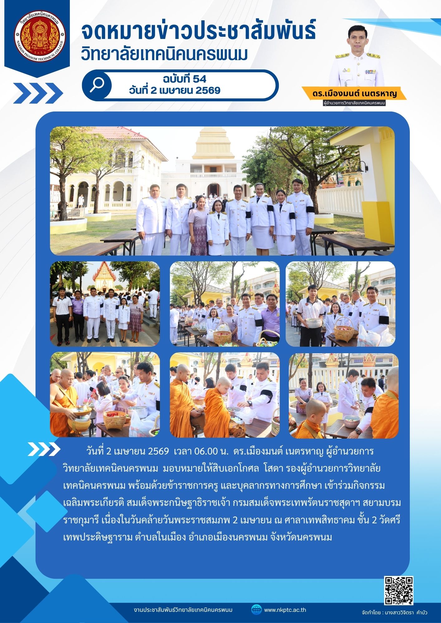 วันที่ 2 เมษายน 2569 เวลา 06.00 น. ดร.เมืองมนต์ เนตรหาญ ผู้อำนวยการวิทยาลัยเทคนิคนครพนม มอบหมายให้สิบเอกโกศล โสดา รองผู้อำนวยการวิทยาลัยเทคนิคนครพนม พร้อมด้วยข้าราชการครู และบุคลากรทางการศึกษา เข้าร่วมกิจกรรมเฉลิมพระเกียรติ สมเด็จพระกนิษฐาธิราชเจ้า กรมสมเด็จพระเทพรัตนราชสุดาฯ สยามบรมราชกุมารี เนื่องในวันคล้ายวันพระราชสมภพ 2 เมษายน ณ ศาลาเทพสิทธาคม ชั้น 2 วัดศรีเทพประดิษฐาราม ตำบลในเมือง อำเภอเมืองนครพนม จังหวัดนครพนม ภาพกิจกรรม : https://drive.google.com/…/1xpI…