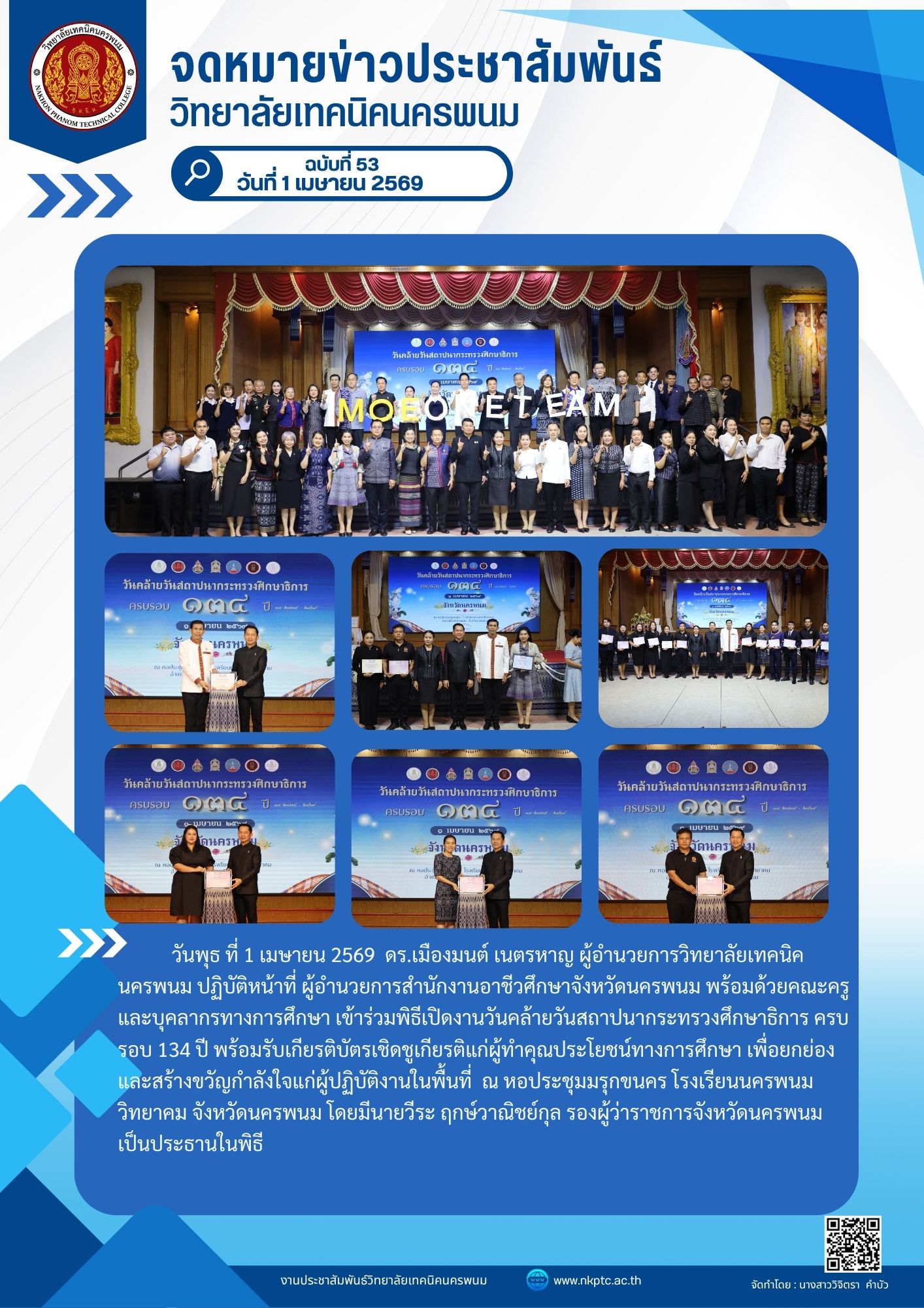 วันพุธ ที่ 1 เมษายน 2569 ดร.เมืองมนต์ เนตรหาญ ผู้อำนวยการวิทยาลัยเทคนิคนครพนม ปฏิบัติหน้าที่ ผู้อำนวยการสำนักงานอาชีวศึกษาจังหวัดนครพนม พร้อมด้วยคณะครู และบุคลากรทางการศึกษา เข้าร่วมพิธีเปิดงานวันคล้ายวันสถาปนากระทรวงศึกษาธิการ ครบรอบ 134 ปี พร้อมรับเกียรติบัตรเชิดชูเกียรติแก่ผู้ทำคุณประโยชน์ทางการศึกษา เพื่อยกย่องและสร้างขวัญกำลังใจแก่ผู้ปฏิบัติงานในพื้นที่ ณ หอประชุมมรุกขนคร โรงเรียนนครพนมวิทยาคม จังหวัดนครพนม โดยมีนายวีระ ฤกษ์วาณิชย์กุล รองผู้ว่าราชการจังหวัดนครพนม เป็นประธานในพิธี ภาพกิจกรรม : https://drive.google.com/…/1EuKLBJP…
