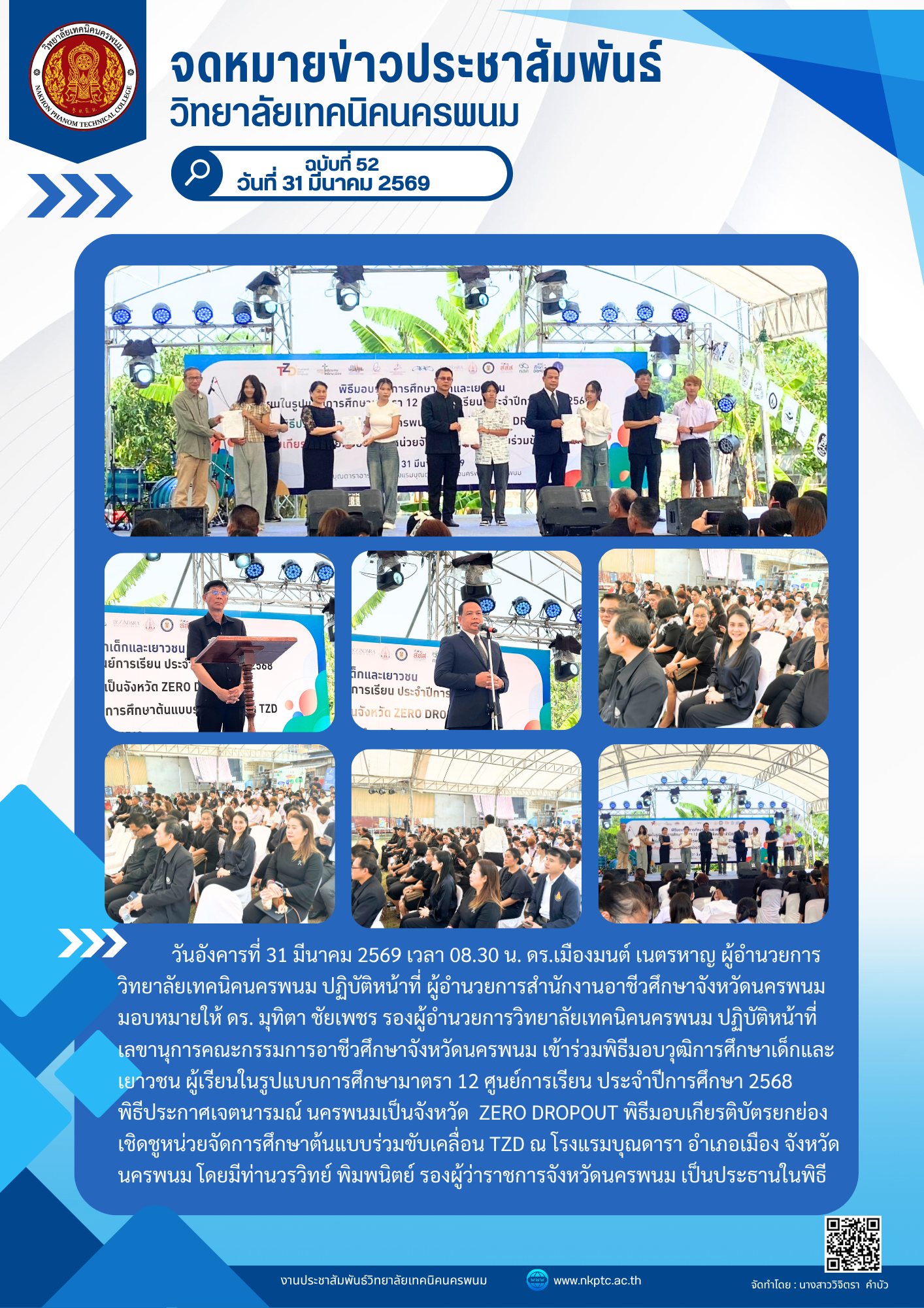 วันอังคารที่ 31 มีนาคม 2569 เวลา 08.30 น. ดร.เมืองมนต์ เนตรหาญ ผู้อำนวยการวิทยาลัยเทคนิคนครพนม ปฏิบัติหน้าที่ ผู้อำนวยการสำนักงานอาชีวศึกษาจังหวัดนครพนม มอบหมายให้ ดร. มุทิตา ชัยเพชร รองผู้อำนวยการวิทยาลัยเทคนิคนครพนม ปฏิบัติหน้าที่ เลขานุการคณะกรรมการอาชีวศึกษาจังหวัดนครพนม เข้าร่วมพิธีมอบวุฒิการศึกษาเด็กและเยาวชน ผู้เรียนในรูปแบบการศึกษามาตรา 12 ศูนย์การเรียน ประจำปีการศึกษา 2568 พิธีประกาศเจตนารมณ์ นครพนมเป็นจังหวัด ZERO DROPOUT พิธีมอบเกียรติบัตรยกย่องเชิดชูหน่วยจัดการศึกษาต้นแบบร่วมขับเคลื่อน TZD ณ โรงแรมบุณดารา อำเภอเมือง จังหวัดนครพนม โดยมีท่านวรวิทย์ พิมพนิตย์ รองผู้ว่าราชการจังหวัดนครพนม เป็นประธานในพิธี